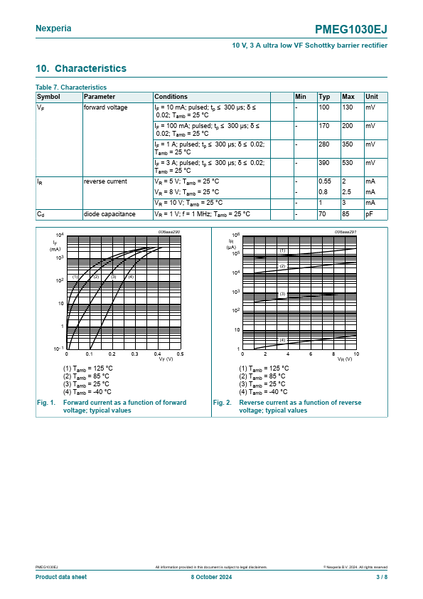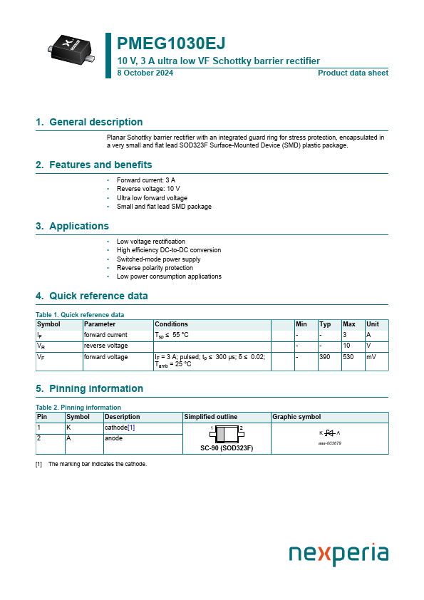 Overview: PMEG1030EJ 10 V, 3 A ultra low VF Schottky barrier rectifier 8 October 2024 Product data sheet 1.