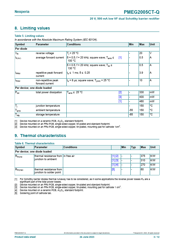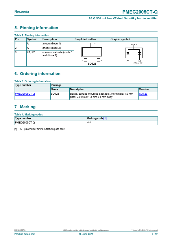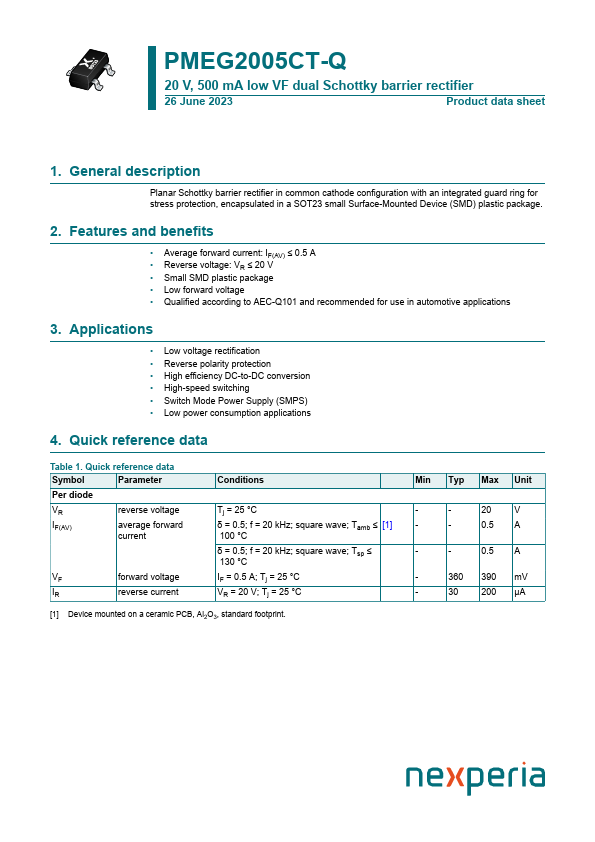 Overview: PMEG2005CT-Q 20 V, 500 mA low VF dual Schottky barrier rectifier 26 June 2023 Product data sheet 1.