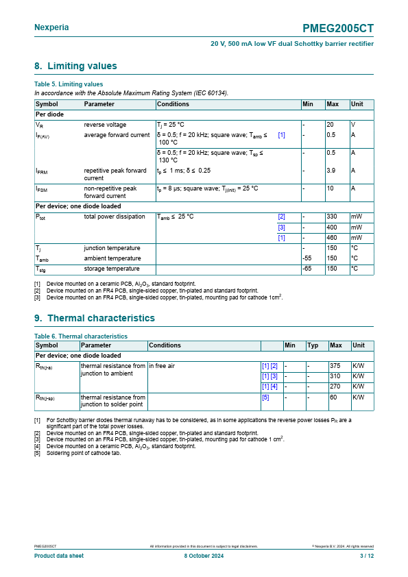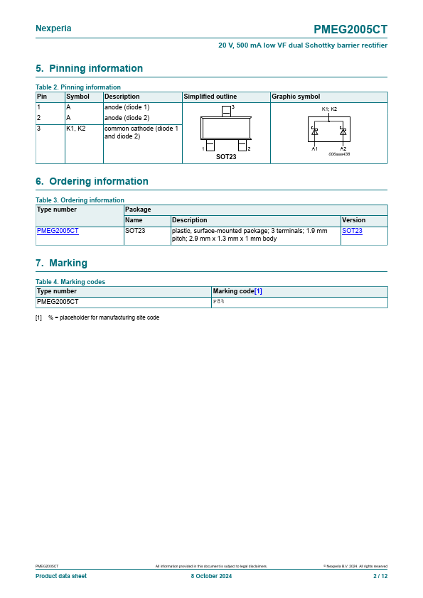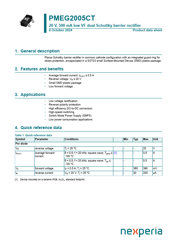 Overview: PMEG2005CT 20 V, 500 mA low VF dual Schottky barrier rectifier 8 October 2024 Product data sheet 1.