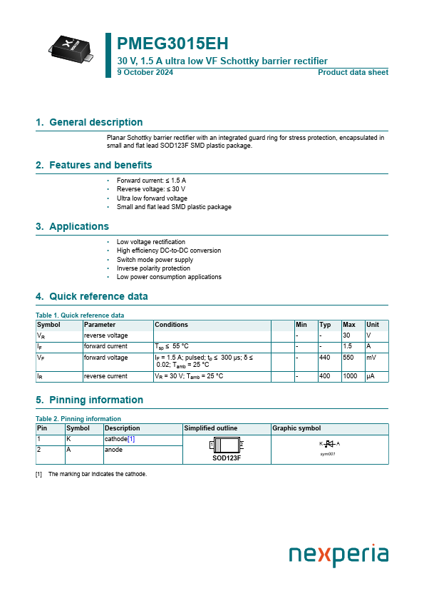 Overview: PMEG3015EH 30 V, 1.5 A ultra low VF Schottky barrier rectifier 9 October 2024 Product data sheet 1.