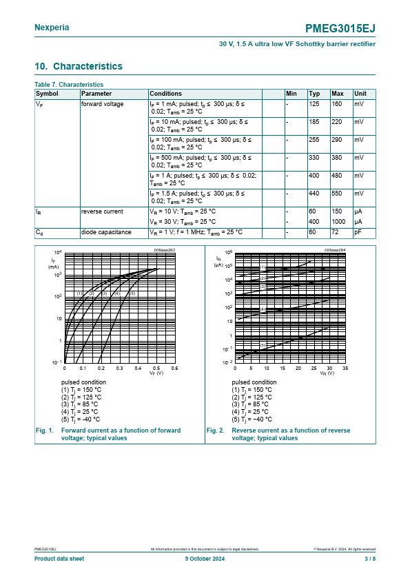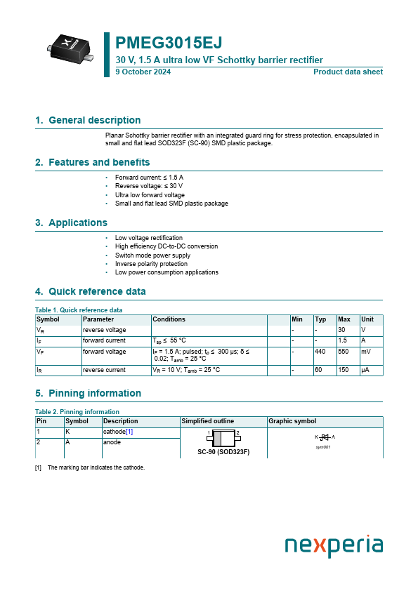 Overview: PMEG3015EJ 30 V, 1.5 A ultra low VF Schottky barrier rectifier 9 October 2024 Product data sheet 1.