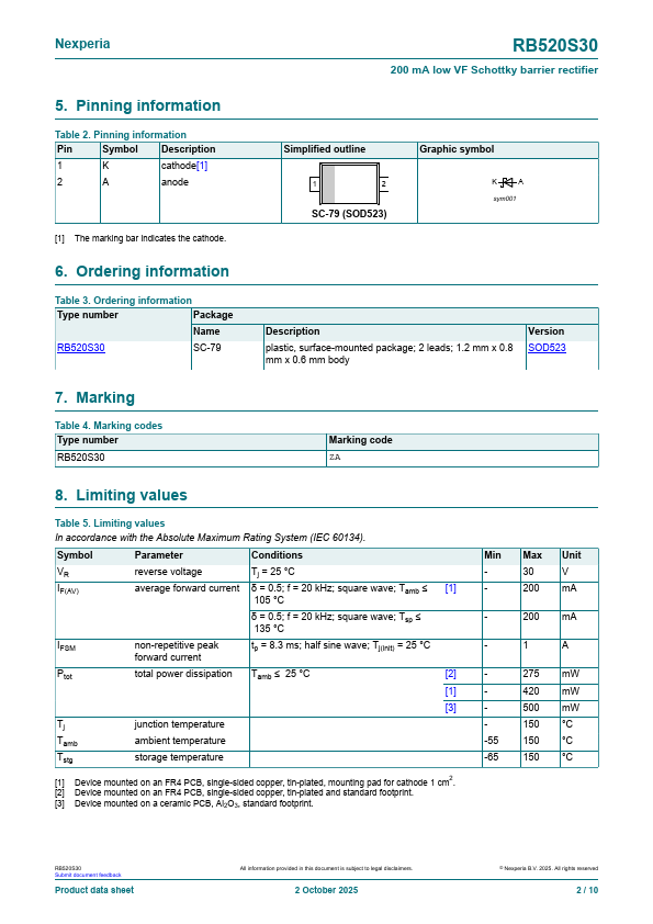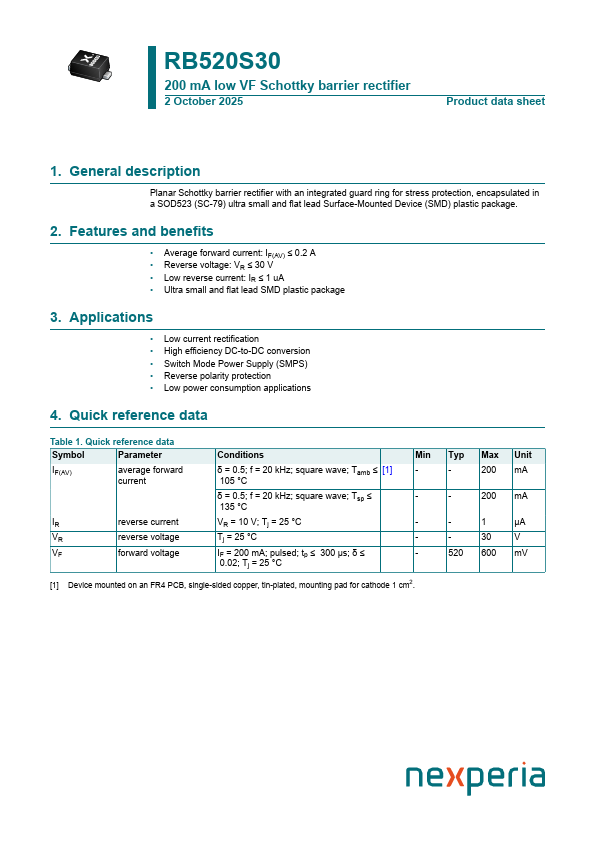 Planar Schottky barrier rectifier with an integrated guard ring for stress protection, encapsulated in a SOD523 (SC-79) ultra small and flat lead Surface-Mounted Device (SMD) plastic package.
