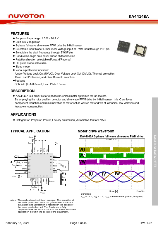 ⚫ KA44143A is a driver IC for 3-phase brushless motor optimized for fan motors. By employing the rotor position detector and sine wave PWM drive by 1-Hall-sensor, this IC achieves ponent reduction and miniaturization of motor set as well as motor drive at low noise, low vibration and low power consumption. The application circuit is an example.