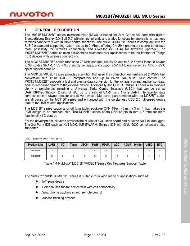 The M031BT/M032BT series microcontroller (MCU) is based on Arm Cortex-M0 core with built-in Bluetooth Low Energy 5.0 (BLE 5.0) with rich peripherals and analog functions for applications that need wireless connectivity with multiple control functions. The M031BT/M032BT series is pliant with the BLE 5.0 standard supporting data rates up to 2 Mbps, offering 2.4 GHz proprietary stacks to achieve more possibility for...