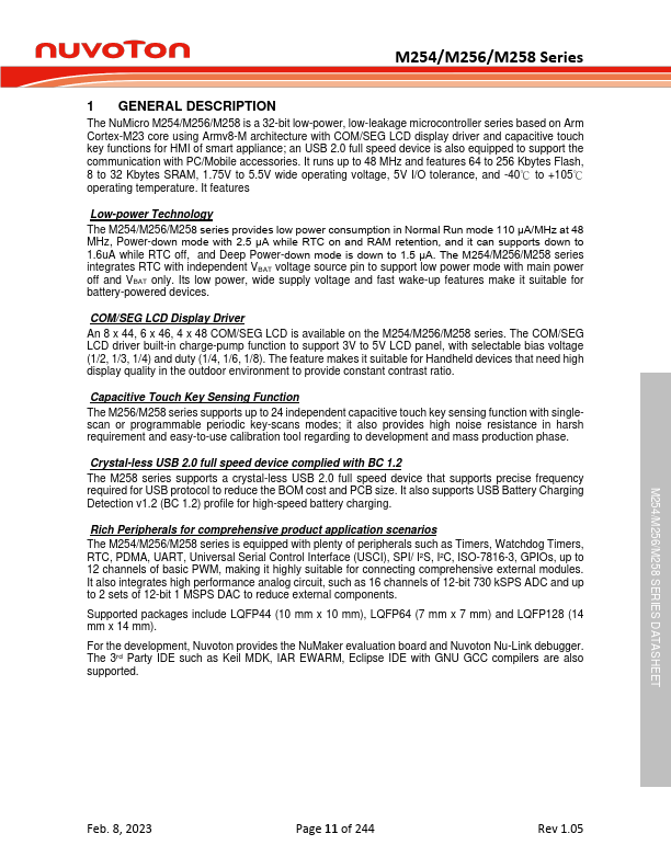 The NuMicro M254/M256/M258 is a 32-bit low-power, low-leakage microcontroller series based on Arm Cortex-M23 core using Armv8-M architecture with /SEG LCD display driver and capacitive touch key functions for HMI of smart appliance; an USB 2.0 full speed device is also equipped to support the munication with PC/Mobile accessories.