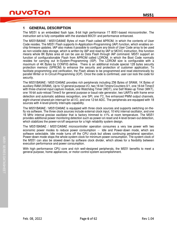 The MS51 is an embedded flash type, 8-bit high performance 1T 8051-based microcontroller. The instruction set is fully patible with the standard 80C51 and performance enhanced. The MS51BA9AE / MS51DA9AE Bytes of main Flash called APROM, in which the contents of User Code resides.