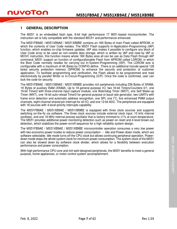 The MS51 is an embedded flash type, 8-bit high performance 1T 8051-based microcontroller. The instruction set is fully patible with the standard 80C51 and performance enhanced. The MS51FB9AE / MS51XB9AE / MS51XB9BE contains an 16K Bytes of main Flash called APROM, in which the contents of User Code resides.