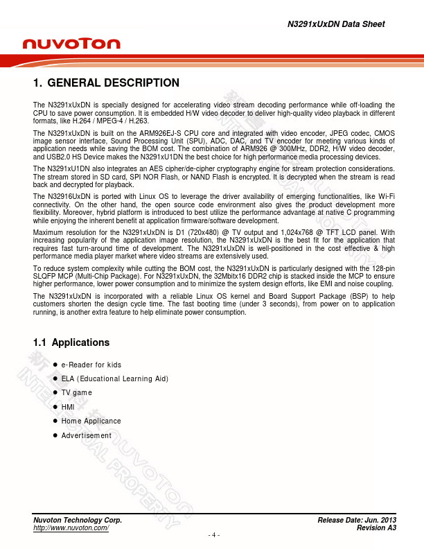 The N3291xUxDN is specially designed for accelerating video stream decoding performance while off-loading the CPU to save power consumption. It is embedded H/W video decoder to deliver high-quality video playback in different formats, like H.264 / MPEG-4 / H.263. The N3291xUxDN is built on the ARM926EJ-S CPU core and integrated with video encoder, JPEG codec, CMOS image sensor interface, Sound Processing Unit (SPU),...