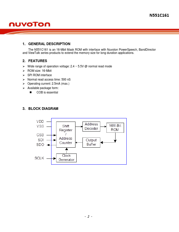 The N551C161 is an 16-Mbit Mask ROM with interface with Nuvoton PowerSpeech, BandDirector and ViewTalk series products to extend the memory size for long duration applications.