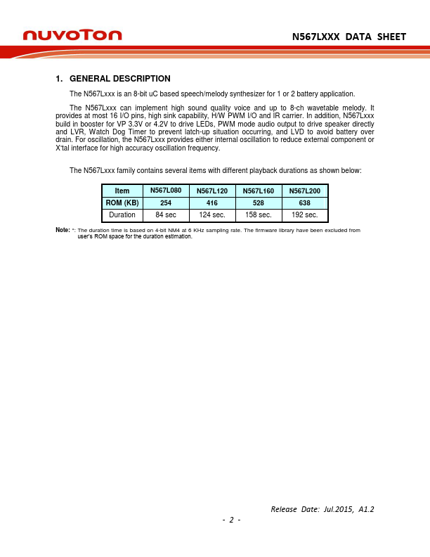The N567Lxxx is an 8-bit uC based speech/melody synthesizer for 1 or 2 battery application. The N567Lxxx can implement high sound quality voice and up to 8-ch wavetable melody. It provides at most 16 I/O pins, high sink capability, H/W PWM I/O and IR carrier.