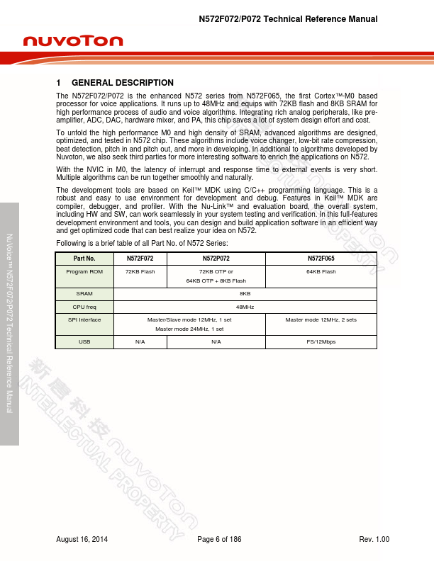 The N572F072/P072 is the enhanced N572 series from N572F065, the first Cortex™-M0 based processor for voice applications. It runs up to 48MHz and equips with 72KB flash and 8KB SRAM for high performance process of audio and voice algorithms. Integrating rich analog peripherals, like preamplifier, ADC, DAC, hardware mixer, and PA, this chip saves a lot of system design effort and cost.