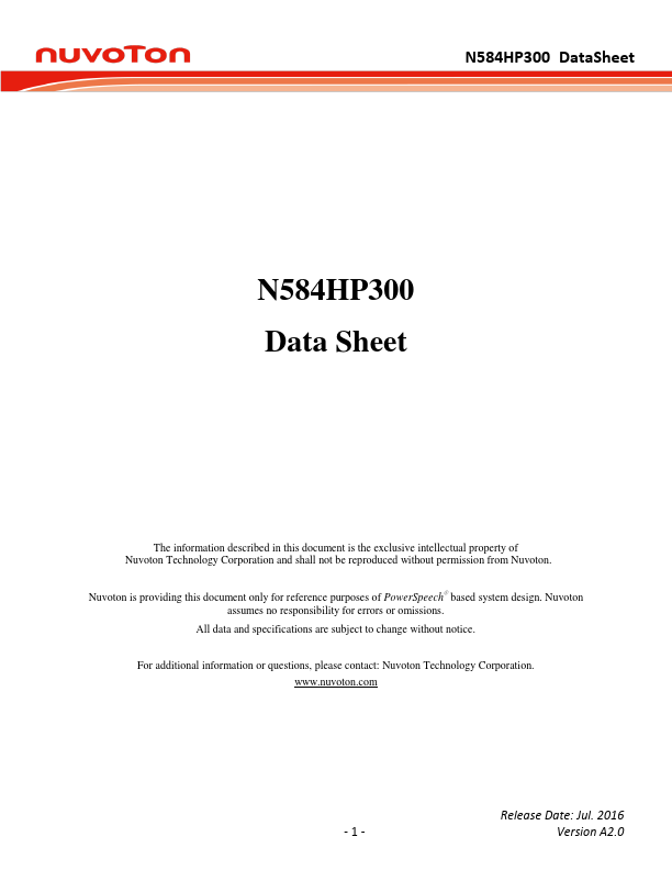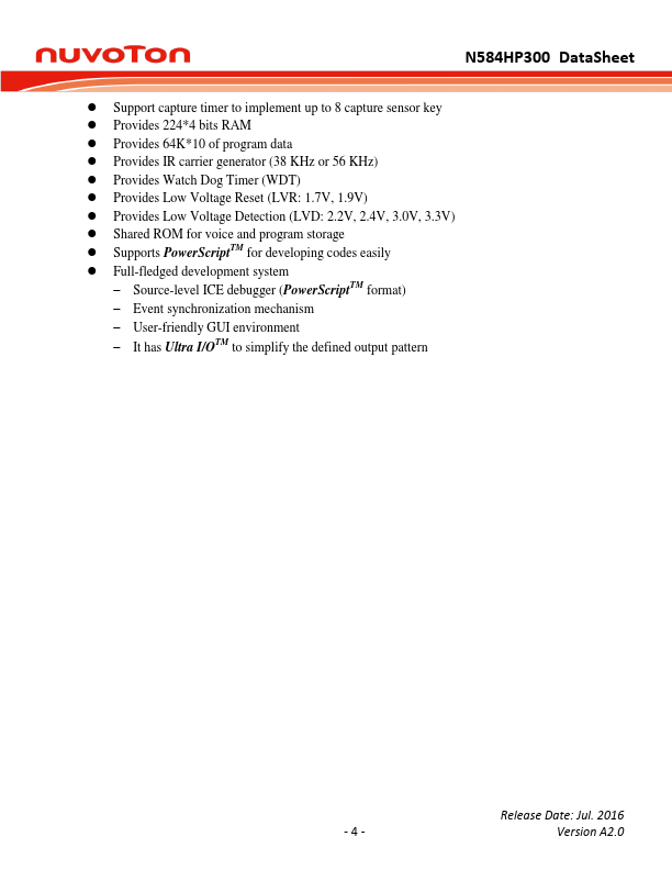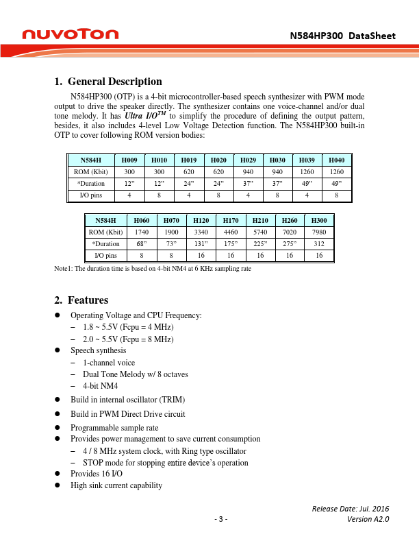 N584HP300 (OTP) is a 4-bit microcontroller-based speech synthesizer with PWM mode output to drive the speaker directly. The synthesizer contains one voice-channel and/or dual tone melody. It has Ultra I/OTM to simplify the procedure of defining the output pattern, besides, it also includes 4-level Low Voltage Detection function.