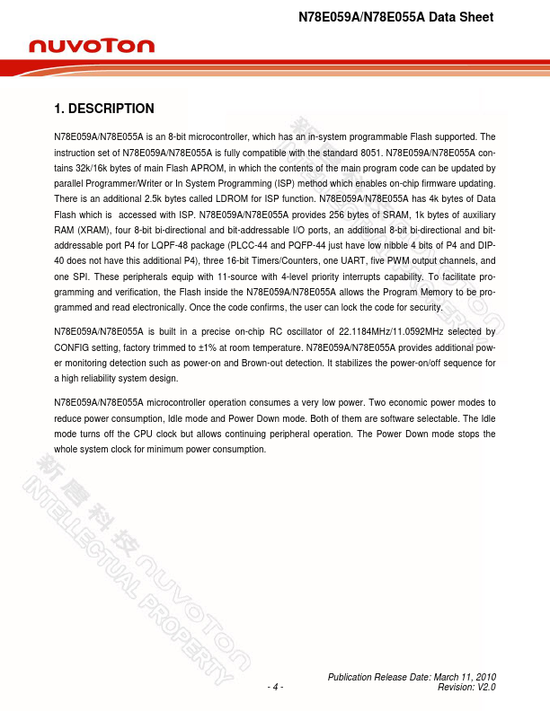 N78E059A/N78E055A is an 8-bit microcontroller, which has an in-system programmable Flash supported. The instruction set of N78E059A/N78E055A is fully patible with the standard 8051. N78E059A/N78E055A contains 32k/16k bytes of main Flash APROM, in which the contents of the main program code can be updated by parallel Programmer/Writer or In System Programming (ISP) method which enables on-chip firmware updating.