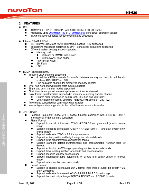 The N9H20 series is built on the ARM926EJ-S, synchronous DRAM, 2D BitBLT accelerator, LCD panel interface, USB 1.1 Host & USB2.0 HS Device core and integrated with JPEG codec, 32-channel SPU (Sound Processing Unit), ADC, DAC, for meeting various kinds of application needs for saving the BOM cost and makes the best choice for LCD application of cost/performance products. Maximum resolution is XVGA (1,024x768)@TFT LCD...