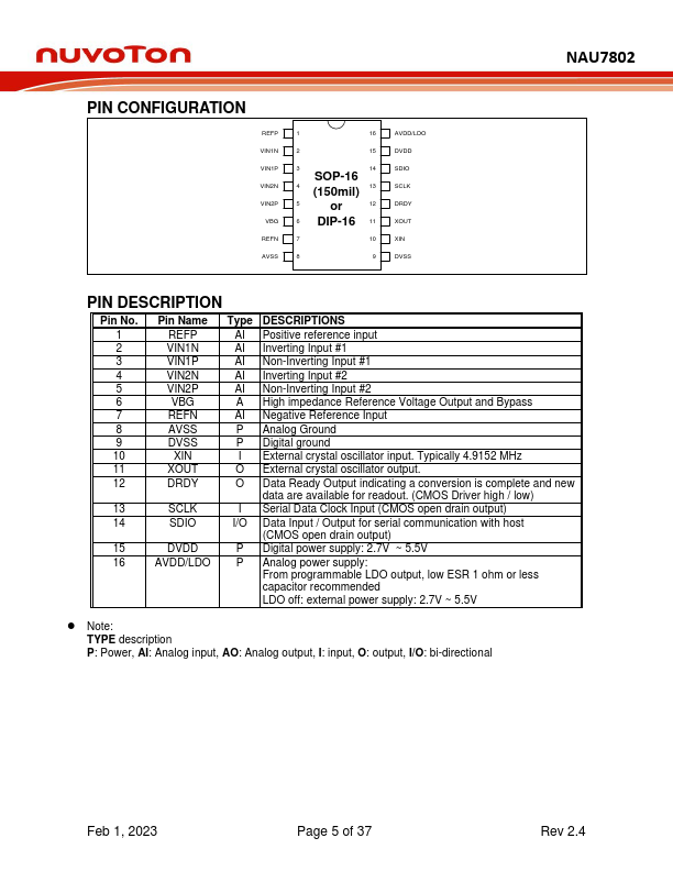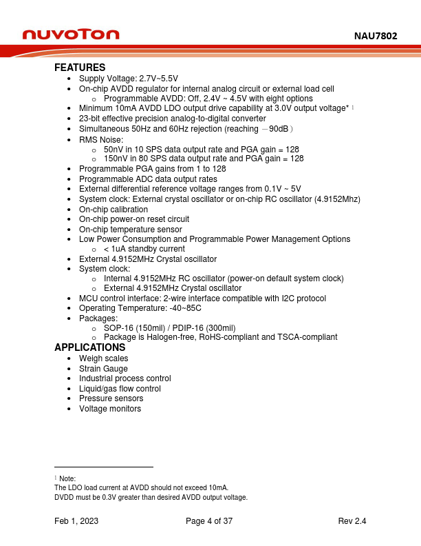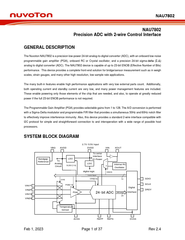 The Nuvoton NAU7802 is a precision low-power 24-bit analog-to-digital converter (ADC), with an onboard low-noise programmable gain amplifier (PGA), onboard RC or Crystal oscillator, and a precision 24-bit sigma-delta (Σ-Δ) analog to digital converter (ADC). The NAU7802 device is capable of up to 23-bit ENOB (Effective Number of Bits) performance. This device provides a plete front-end solution for bridge/sensor...