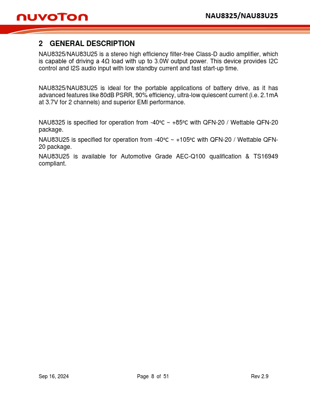 | NAU8325 | stereo high efficiency filter-free Class-D audio amplifier |