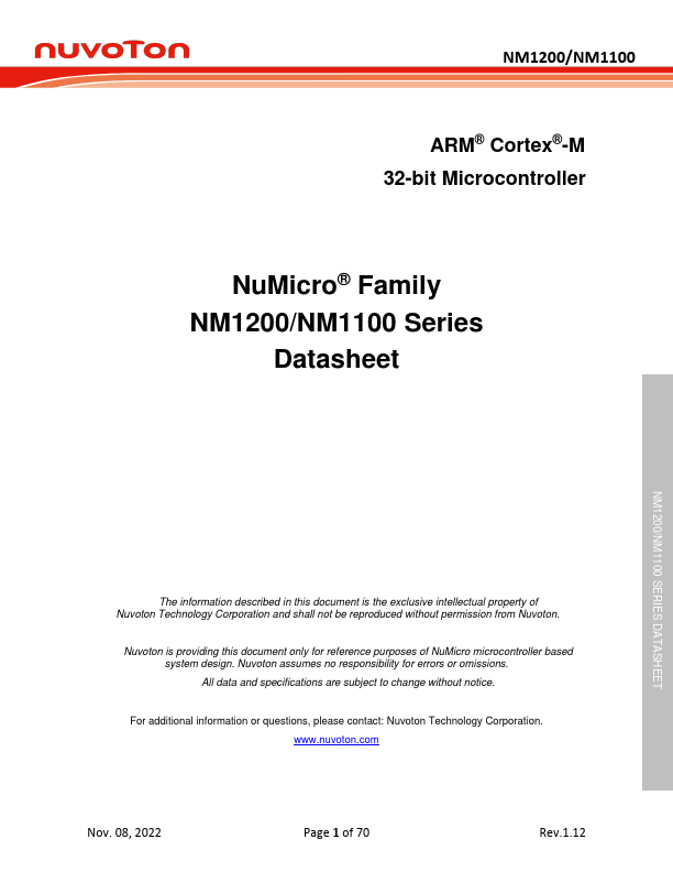 The NuMicro® NM1200/NM1100 series 32-bit microcontroller is embedded with ARM® Cortex® M0 core for industrial control and applications which require high performance, high integration, and low cost. The Cortex® -M0 is the newest ARM® embedded processor with 32-bit performance at a cost equivalent to the traditional 8-bit microcontroller. The NM1200/NM1100 series can run up to 48 MHz and operate at 2.1V ~ 5.5V, -40℃...