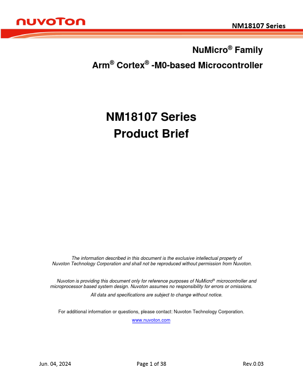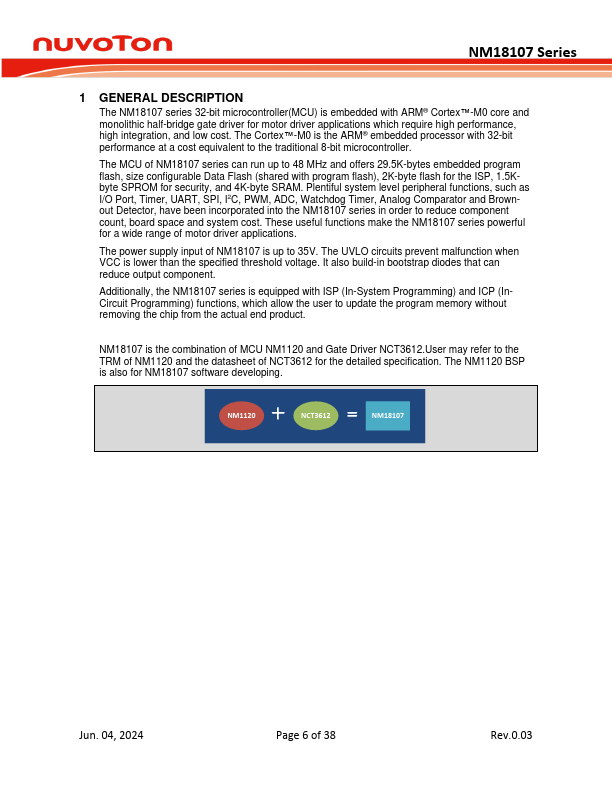 The NM18107 series 32-bit microcontroller(MCU) is embedded with ARM® Cortex™-M0 core and monolithic half-bridge gate driver for motor driver applications which require high performance, high integration, and low cost. The Cortex™-M0 is the ARM® embedded processor with 32-bit performance at a cost equivalent to the traditional 8-bit microcontroller. The MCU of NM18107 series can run up to 48 MHz and offers...