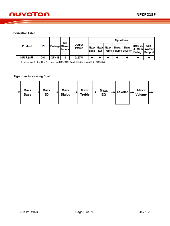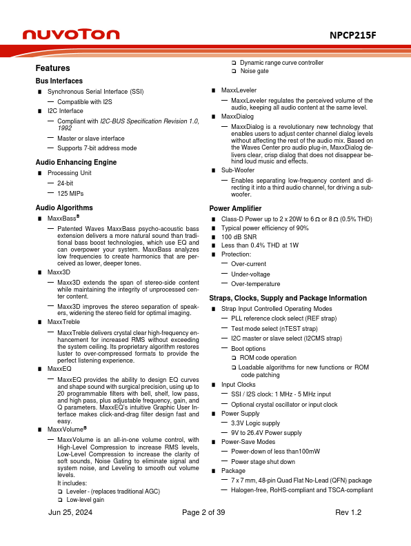 The Nuvoton NPCP215F device is a member of Nuvoton Sound Enhancing family optimized for TV applications. The NPCP215F integrates a Class-D power amplifier with Waves MaxxAudio-3 sound enhancement algorithms. These are proprietary, patented, psychoacoustic algorithms that pensate for the acoustic limitations of smalldimensioned consumer electronics devices and speakers.