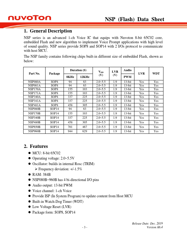NSP series is an advanced 1-ch Voice IC that equips with Nuvoton 8-bit 65C02 core, embedded Flash and new algorithm to implement Voice Prompt applications with high level of sound quality. NSP series provide SOP8 and SOP14 with 2 I/Os protocol to municate with host MCU. The NSP family contains following chips built-in different size of embedded Flash, shown as below:.