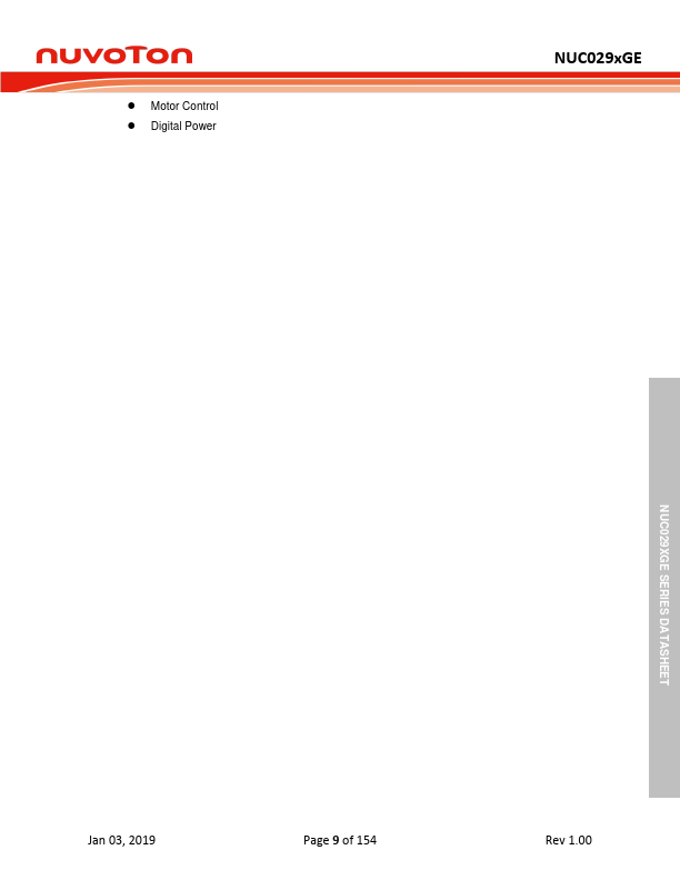 The NuMicro® NUC029xGE of NUC029 series microcontroller based on the Arm® Cortex® -M0 core operates at up to 72 MHz. With its crystal-less USB 2.0 FS interface, it is able to generate precise frequency required by USB protocol without the need of external crystal.
