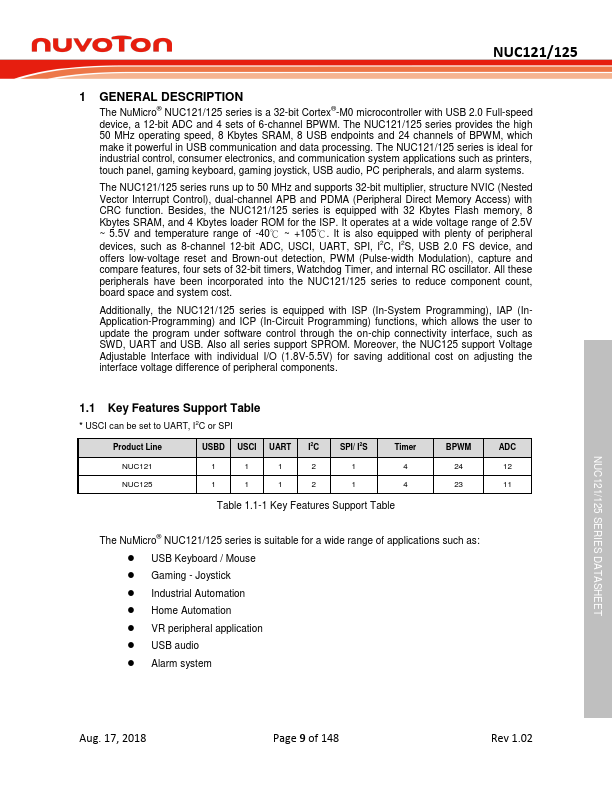 The NuMicro® NUC121/125 series is a 32-bit Cortex® -M0 microcontroller with USB 2.0 Full-speed device, a 12-bit ADC and 4 sets of 6-channel BPWM. The NUC121/125 series provides the high 50 MHz operating speed, 8 Kbytes SRAM, 8 USB endpoints and 24 channels of BPWM, which make it powerful in USB munication and data processing. The NUC121/125 series is ideal for industrial control, consumer electronics, and munication...