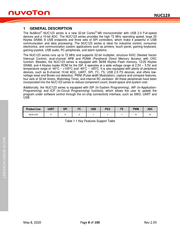 The NuMicro® NUC123 series is a new 32-bit Cortex® -M0 microcontroller with USB 2.0 Full-speed devices and a 10-bit ADC. The NUC123 series provides the high 72 MHz operating speed, large 20 Kbytes SRAM, 8 USB endpoints and three sets of SPI controllers, which make it powerful in USB munication and data processing. The NUC123 series is ideal for industrial control, consumer electronics, and munication system...