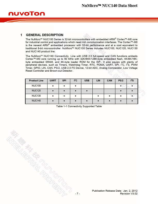 The NuMicro™ NUC100 Series is 32-bit microcontrollers with embedded ARM® Cortex™-M0 core for industrial control and applications which need rich munication interfaces. The Cortex™-M0 is the newest ARM® embedded processor with 32-bit performance and at a cost equivalent to traditional 8-bit microcontroller. NuMicro™ NUC100 Series includes NUC100, NUC120, NUC130 and NUC140 product line.