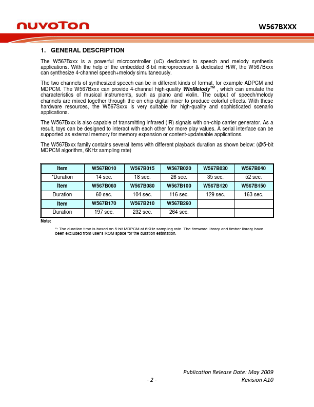 The W567Bxxx is a powerful microcontroller (uC) dedicated to speech and melody synthesis applications.