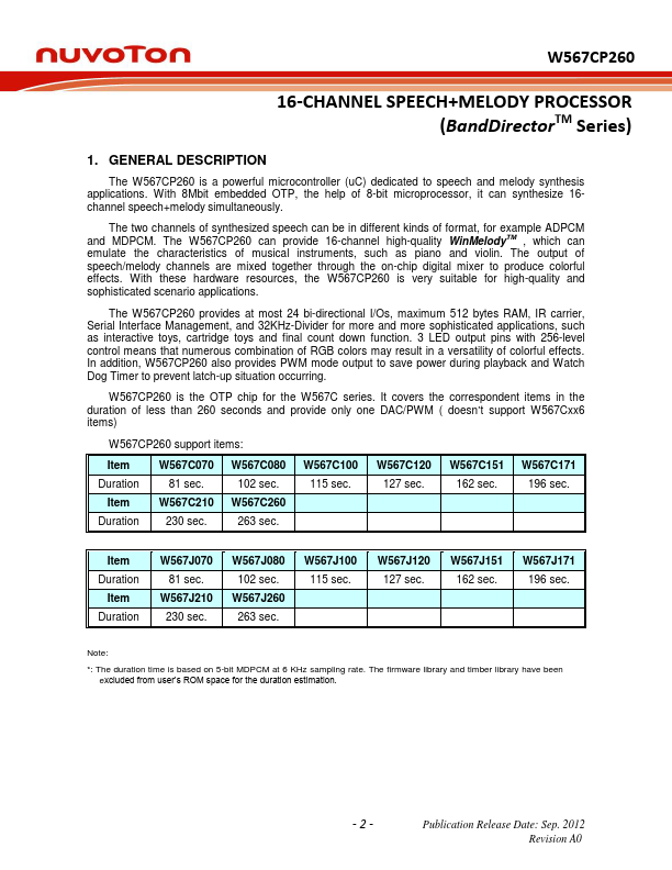 The W567CP260 is a powerful microcontroller (uC) dedicated to speech and melody synthesis applications.
