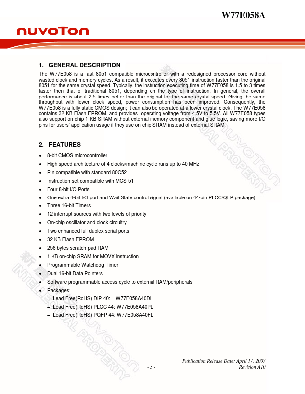 The W77E058 is a fast 8051 patible microcontroller with a redesigned processor core without wasted clock and memory cycles.