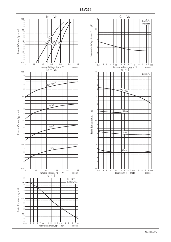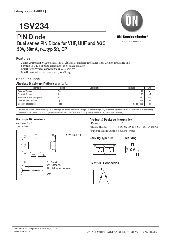 EN3089C 1SV234 PIN Diode Dual series PIN Diode for VHF, UHF and AGC 50V, 50mA, rs=typ 5Ω, CP http://onsemi.