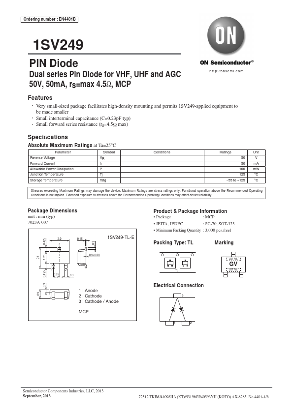 EN4401B 1SV249 PIN Diode Dual series Pin Diode for VHF, UHF and AGC 50V, 50mA, rs=max 4.5Ω, MCP http://onsemi.