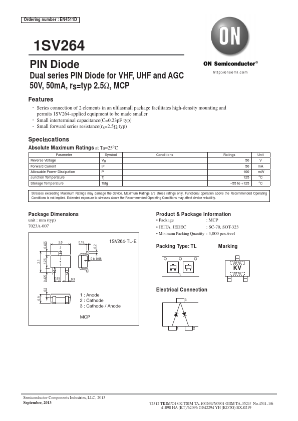 EN4511D 1SV264 PIN Diode Dual series PIN Diode for VHF, UHF and AGC 50V, 50mA, rs=typ 2.5Ω, MCP http://onsemi.