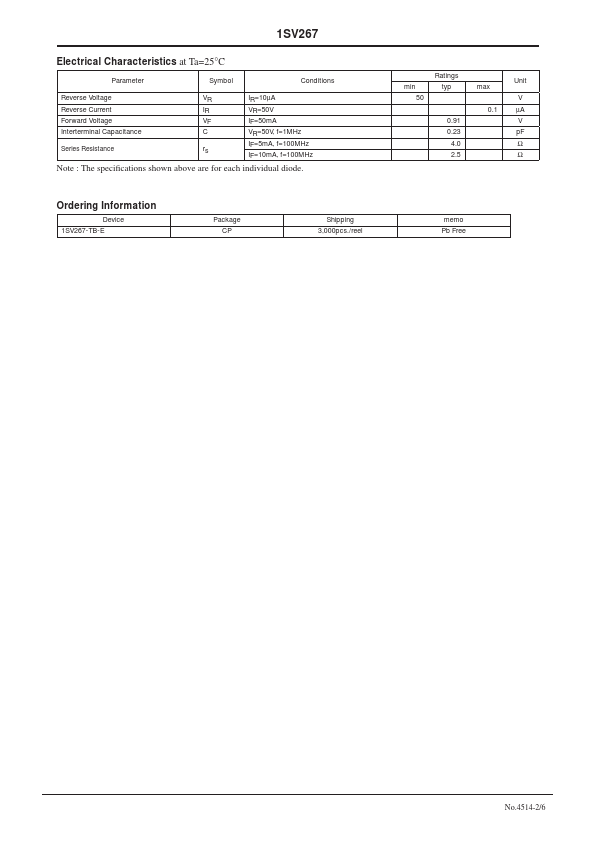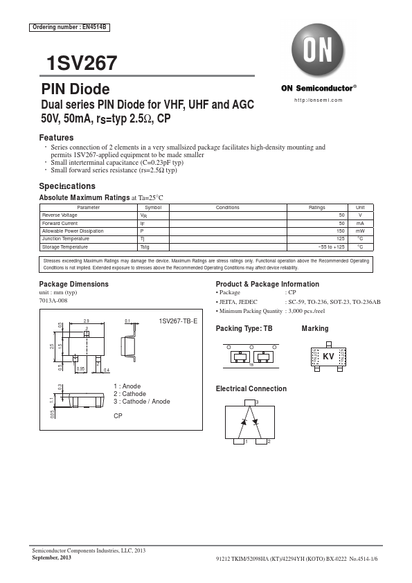 EN4514B 1SV267 PIN Diode Dual series PIN Diode for VHF, UHF and AGC 50V, 50mA, rs=typ 2.5Ω, CP http://onsemi.
