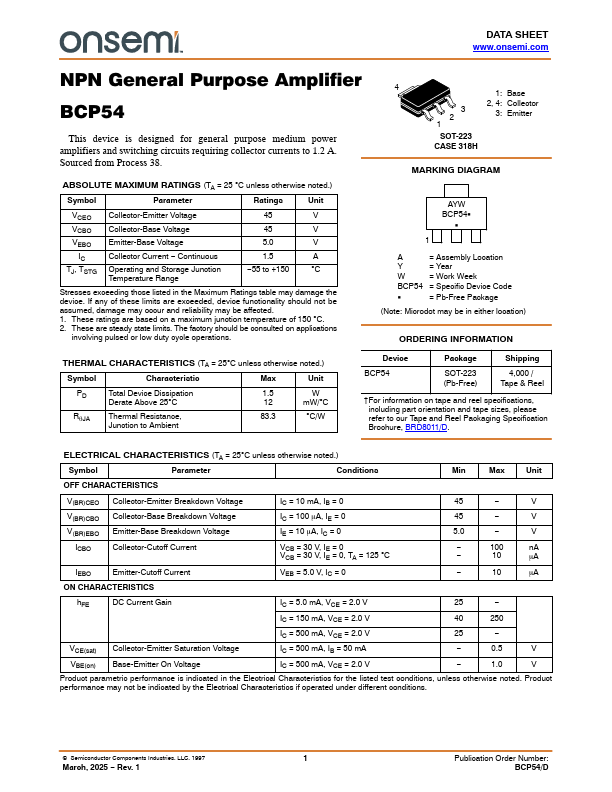 Overview: DATA SHEET www.onsemi.com NPN General Purpose Amplifier BCP54 This device is designed for general purpose medium power amplifiers and switching circuits requiring collector currents to 1.2 A.