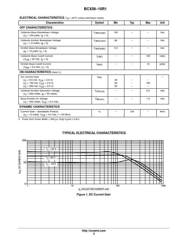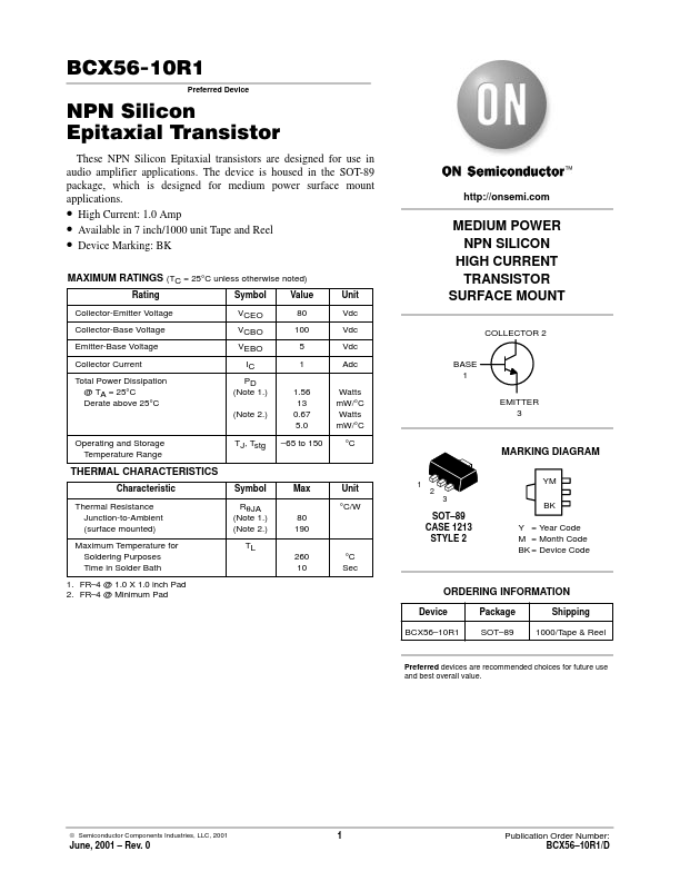 Overview: BCX56-10R1 Preferred Device NPN Silicon Epitaxial Transistor These NPN Silicon Epitaxial transistors are designed for use in audio amplifier applications.