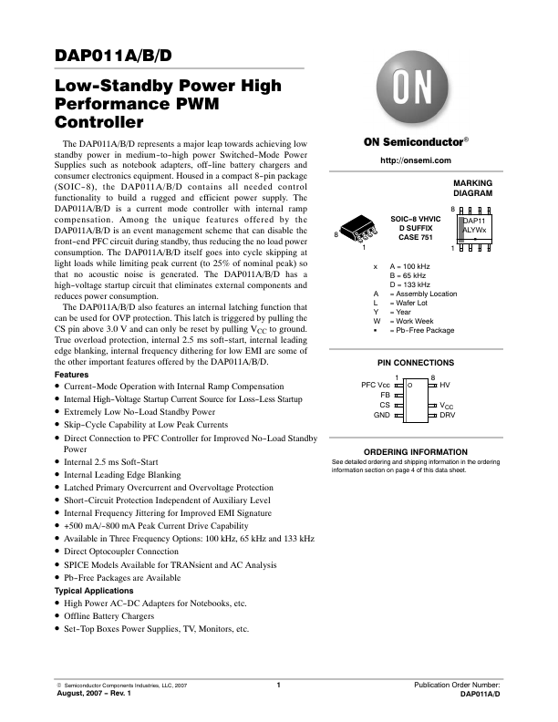 DAP011A/B/D Low-Standby Power High Performance PWM Controller The DAP011A/B/D represents a major leap towards achieving low standby power in medium-to-high power Switched-Mode Power Supplies such as notebook adapters, off-line battery chargers and consumer electronics equipment. Housed in a pact 8-pin package (SOIC-8), the DAP011A/B/D contains all needed control functionality to build a rugged and efficient power...