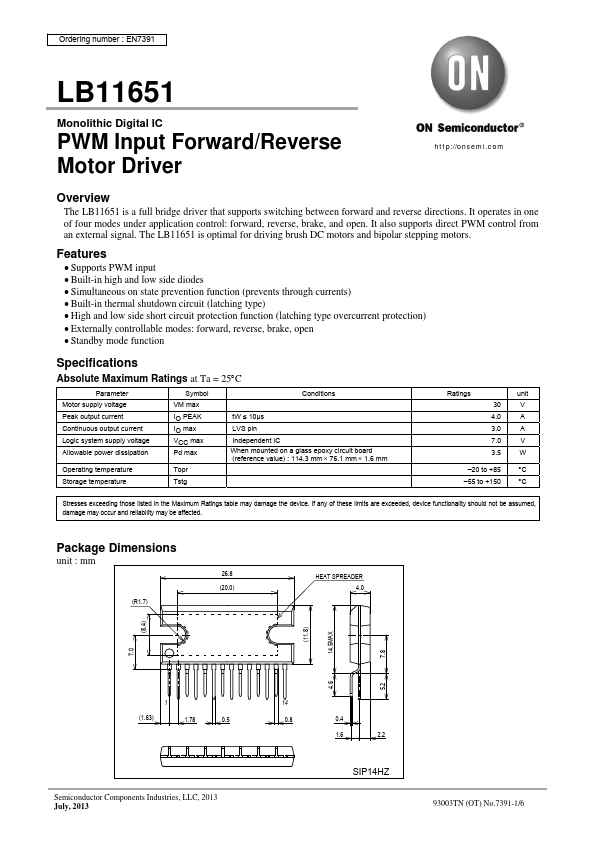 EN7391 LB11651 Monolithic Digital IC PWM Input Forward/Reverse Motor Driver http://onsemi. Overview The LB11651 is a full bridge driver that supports switching between forward and reverse directions. It operates in one of four modes under application control:.