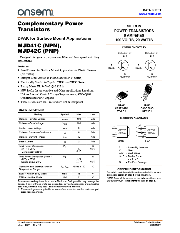 Overview: Complementary Power Transistors DPAK for Surface Mount Applications MJD41Cā(NPN), MJD42Cā(PNP) Designed for general purpose amplifier and low speed switching applications.