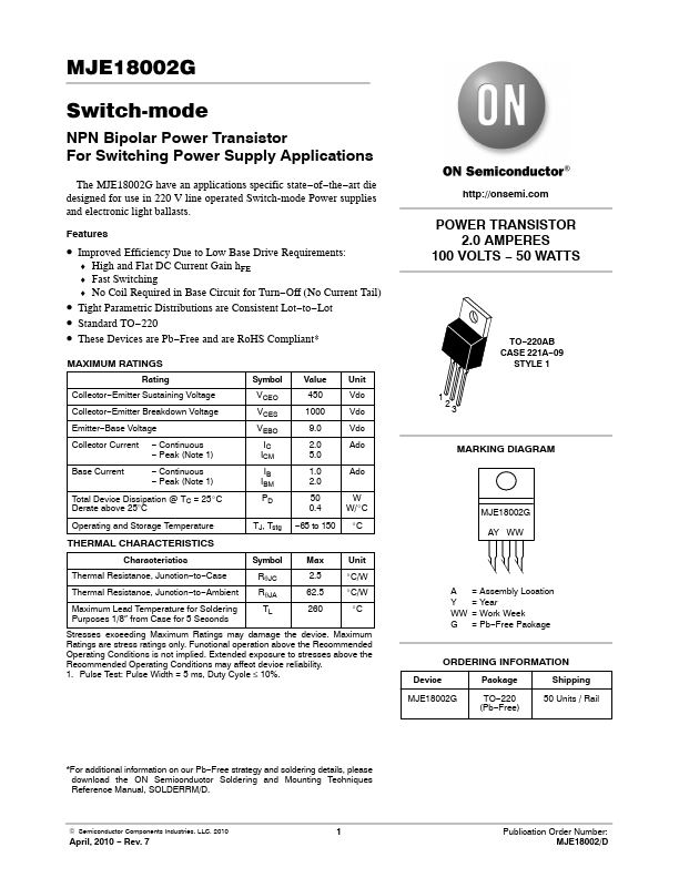 MJE18002G Switch-mode NPN Bipolar Power Transistor For Switching Power Supply Applications The MJE18002G have an applications specific state−of−the−art die designed for use in 220 V line operated Switch-mode Power supplies and electronic light ballasts.
