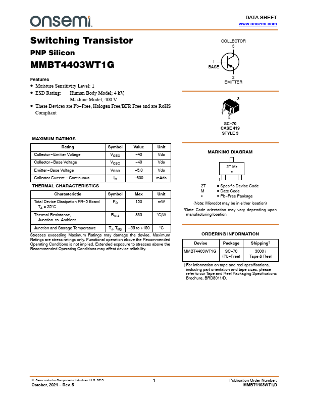 Overview: Switching Transistor PNP Silicon MMBT4403WT1G.