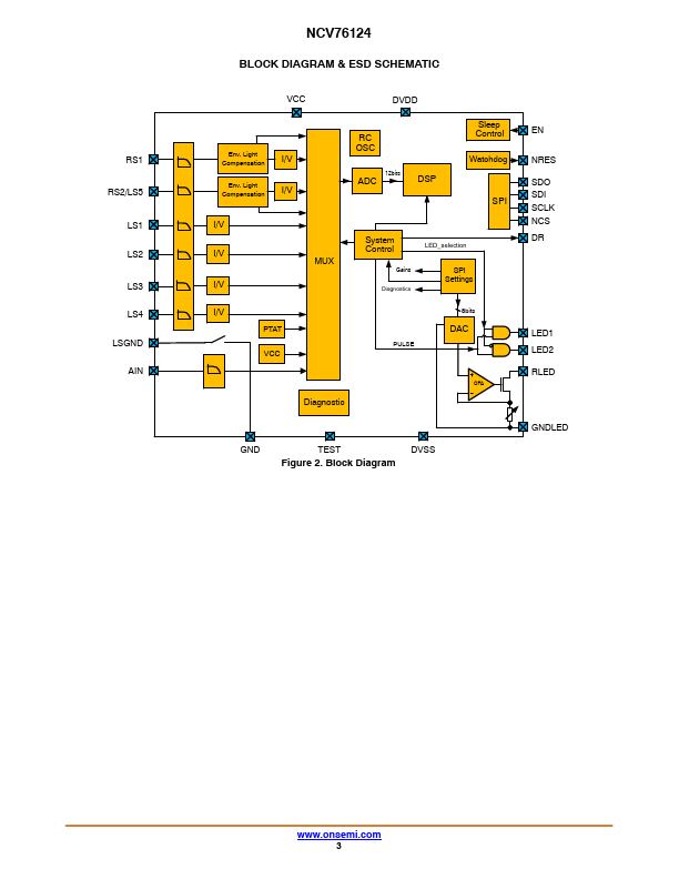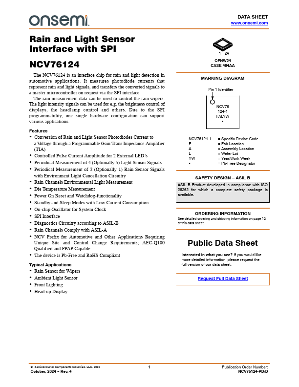 Rain and Light Sensor Interface with SPI NCV76124 The NCV76124 is an interface chip for rain and light detection in automotive applications. It measures photodiode currents that represent rain and light signals, and transfers the converted signals to a master microcontroller on request via the SPI interface. The rain measurement data can be used to control the rain wipers.