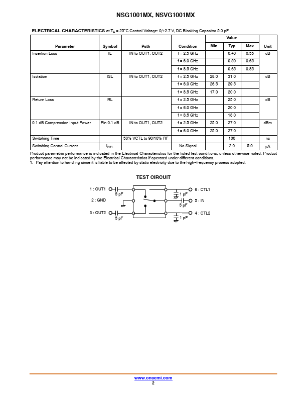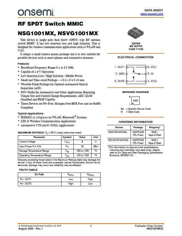 RF SPDT Switch MMIC NSG1001MX, NSVG1001MX This device is single pole dual throw (SPDT) type RF antenna switch MMIC. It has low insertion loss and high isolation. This is designed for wireless munication applications such as WLAN and V2X.