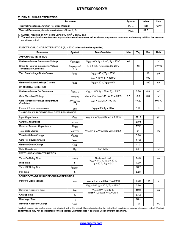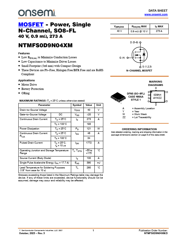 MOSFET - Power, Single N-Channel, SO8-FL 40 V, 0.9 mW, 273 A NTMFS0D9N04XM.