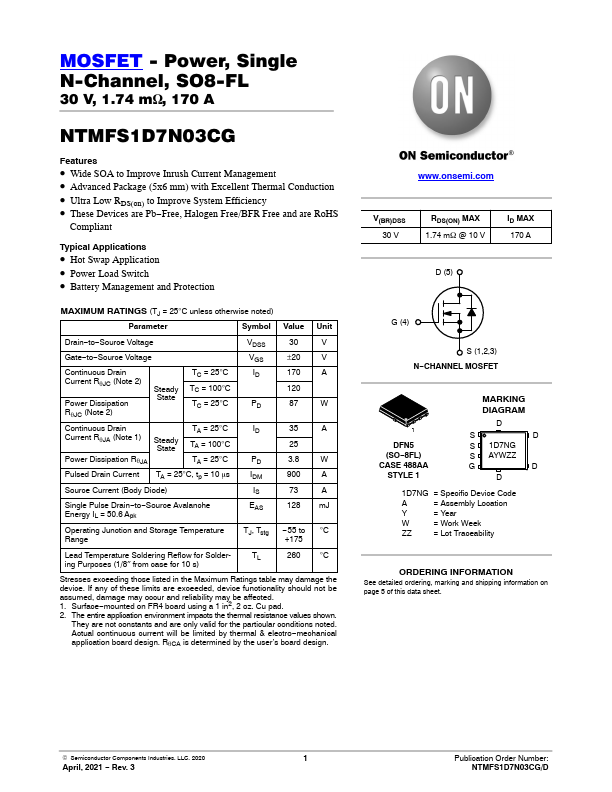 MOSFET - Power, Single N-Channel, SO8-FL 30 V, 1.74 mW, 170 A NTMFS1D7N03CG.