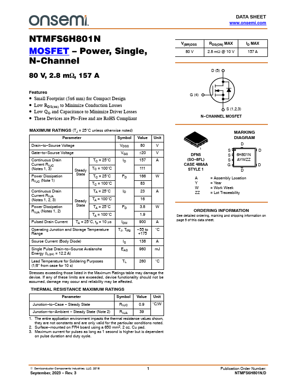 NTMFS6H801N MOSFET Power, Single, N-Channel 80 V, 2.8 mW, 157 A DATA SHEET .onsemi. V(BR)DSS 80 V RDS(ON) MAX 2.8 mW @ 10 V ID MAX 157 A D (5).
