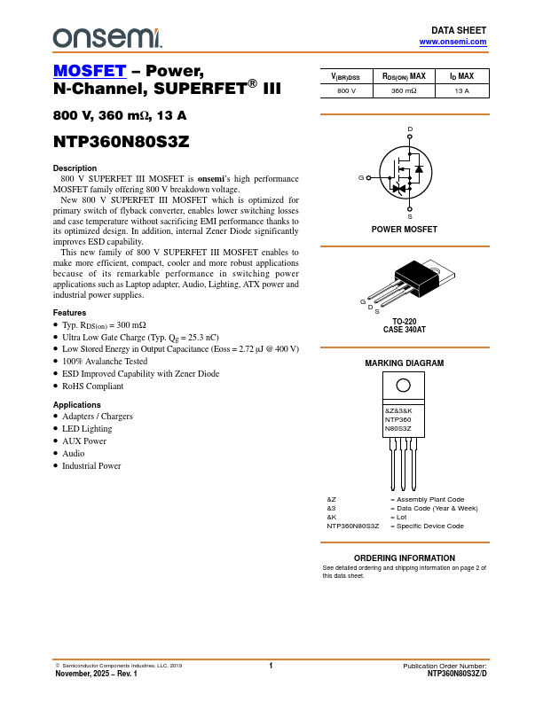 800 V SUPERFET III MOSFET is onsemi’s high performance MOSFET family offering 800 V breakdown voltage. New 800 V SUPERFET III MOSFET which is optimized for primary switch of flyback converter, enables lower switching losses and case temperature without sacrificing EMI performance thanks to its optimized design. In addition, internal Zener Diode significantly improves ESD capability.