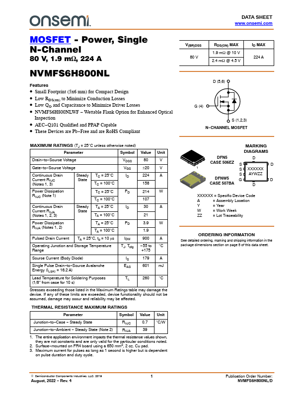 MOSFET - Power, Single N-Channel 80 V, 1.9 mW, 224 A NVMFS6H800NL.