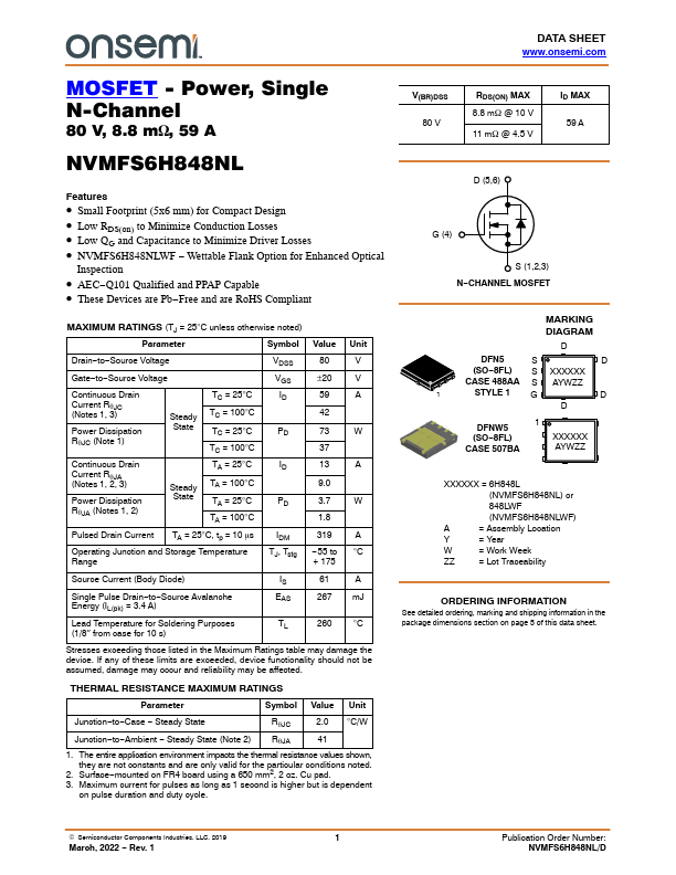 DATA SHEET .onsemi. MOSFET - Power, Single N-Channel 80 V, 8.8 mW, 59 A V(BR)DSS 80 V RDS(ON) MAX 8.8 mW @ 10 V 11 mW @ 4.5 V ID MAX 59.